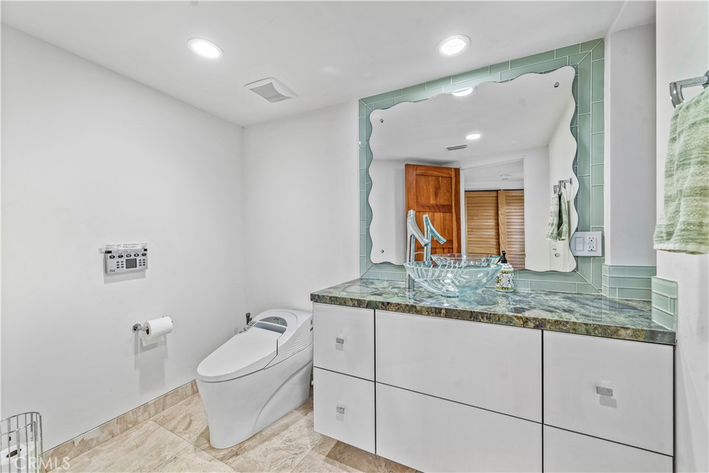 The top level of this magnificent home features an expansive master suite, two additional bedrooms, and a bath. The master suite offers endless ocean views, a spacious walk-in closet, a master spa bath with a separate, three-head shower, a tub with bubbles, dual sinks, and a bidet. The inviting master deck is the perfect spot for complete relaxation and serenity, with views of the ocean and sea breeze.